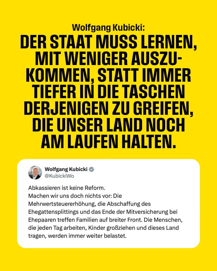 Alle Bürger könnten entlastet werden – ohne Steuererhöhungen. Denn nie hatte der Staat mehr Einnahmen. Aber es fehlt der Mut für Reformen, für einen schlankeren und effizienten Staat – für Einsparungen. Nach der Rekordverschuldung geht die Merz-Regierung wieder den falschen Weg.